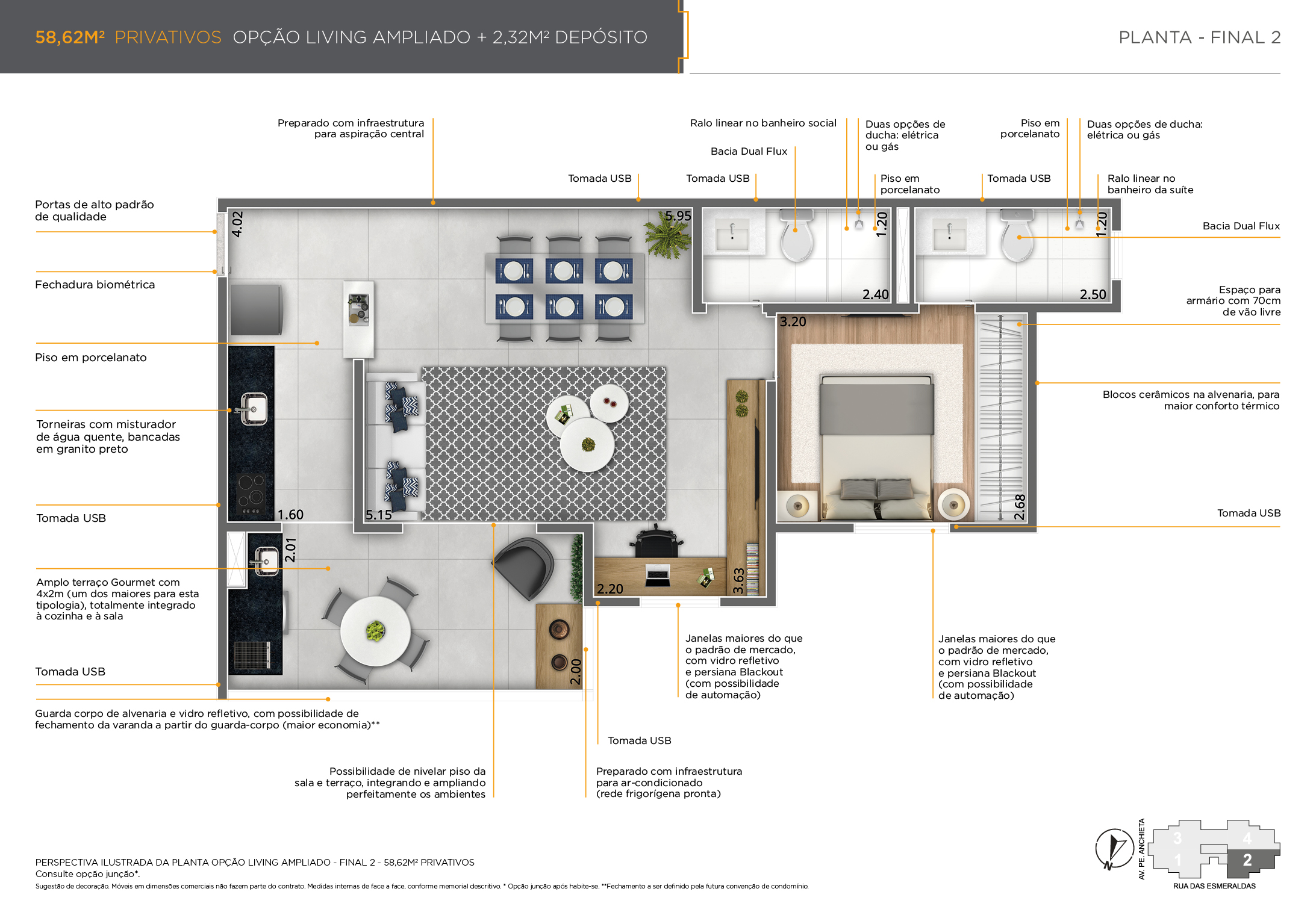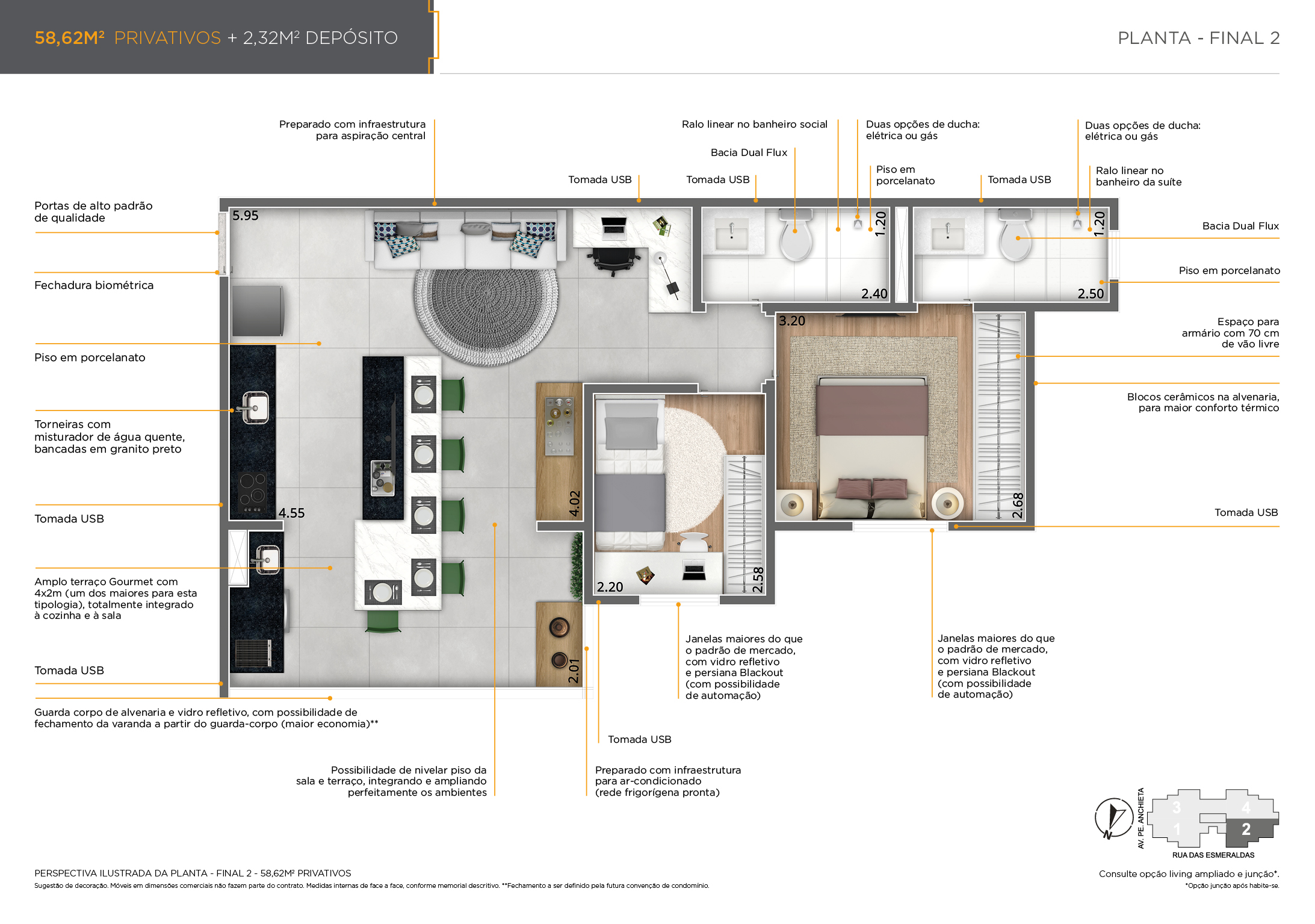 • Área Privativa: Apartamento 58,62m² | Depósito 2,32m²